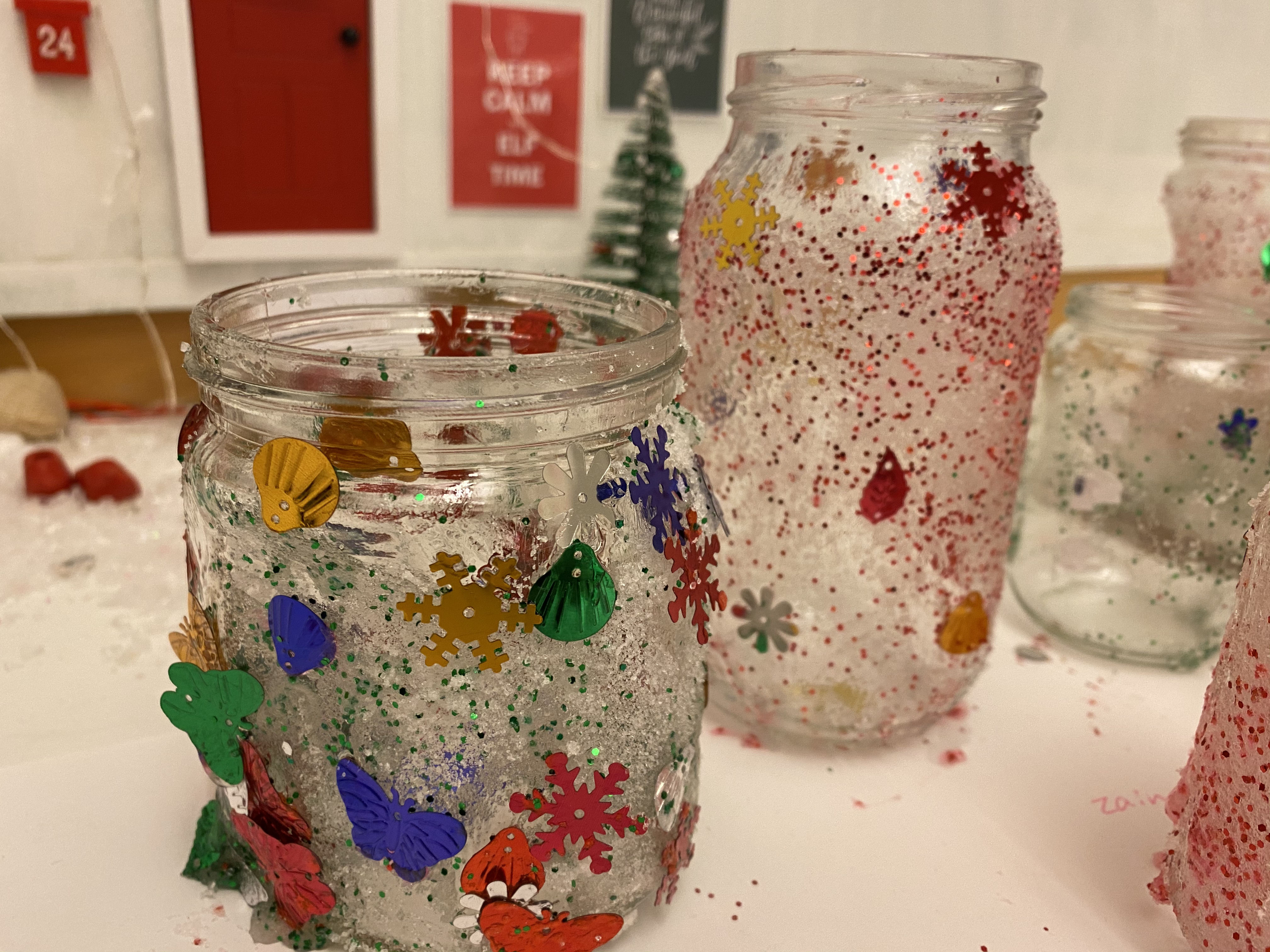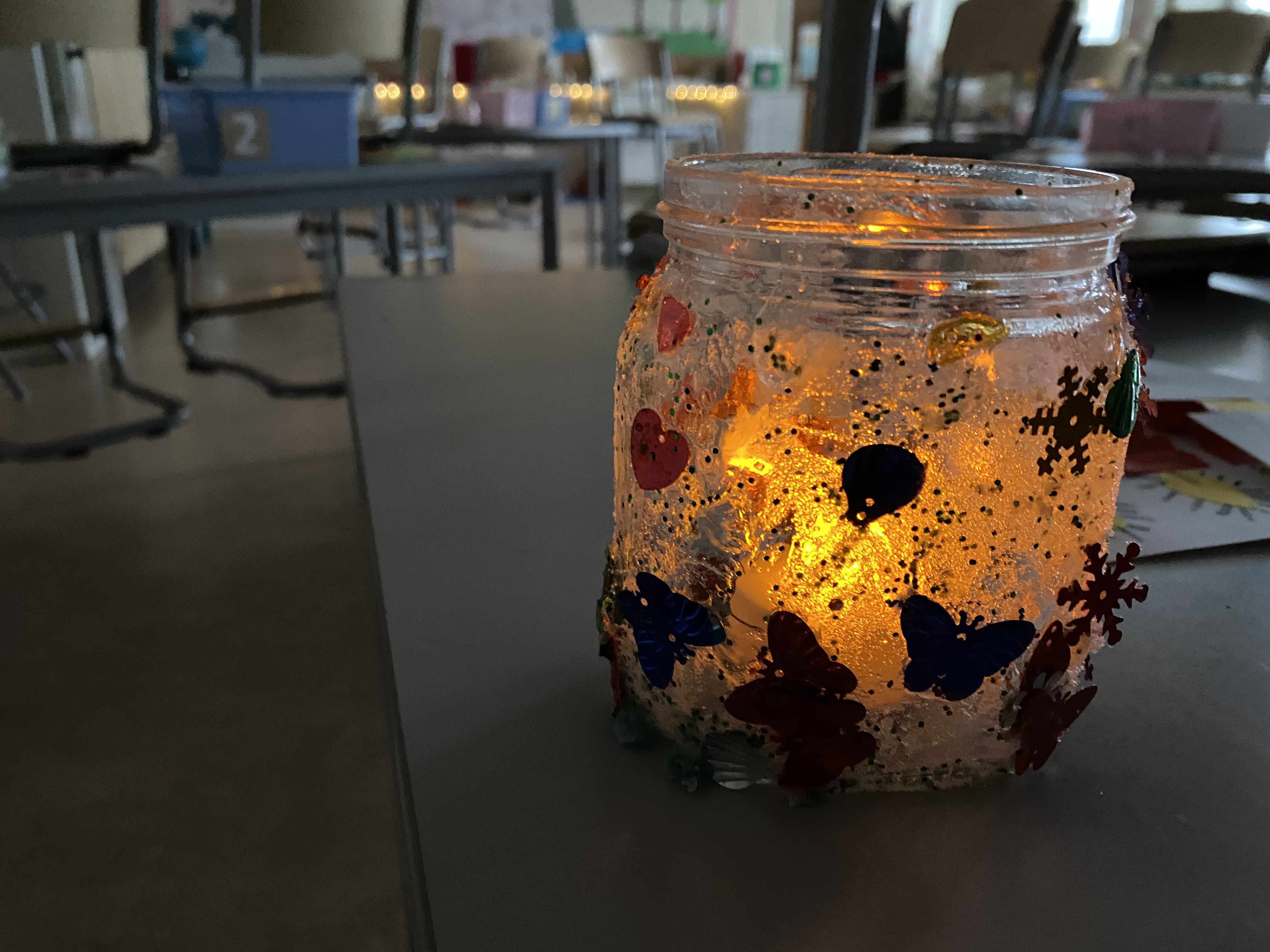 Julpynt i klassrummet. Eleverna har fått göra sockerlyktor i glas. De var jätteenkla att göra men glittret och sockret hamnade självklart överallt (som det brukar göra 🙂 ). Jag blandade socker och glitter. De penslade först på lim på burken och hällde sedan sockerglitter på, sedan limmade de på paljetter. Dessa fick eleverna ha tända på sina bänkar varje morgon när vi kollade på julkalendern. Det skapade en mysig stämning i klassrummet. Om du vill se mer av vårt julpynt har jag lagt upp bilder och videos på min instagram Grundlärarstudenten. Gå in där och klicka sedan på min story som heter ”Jul”.