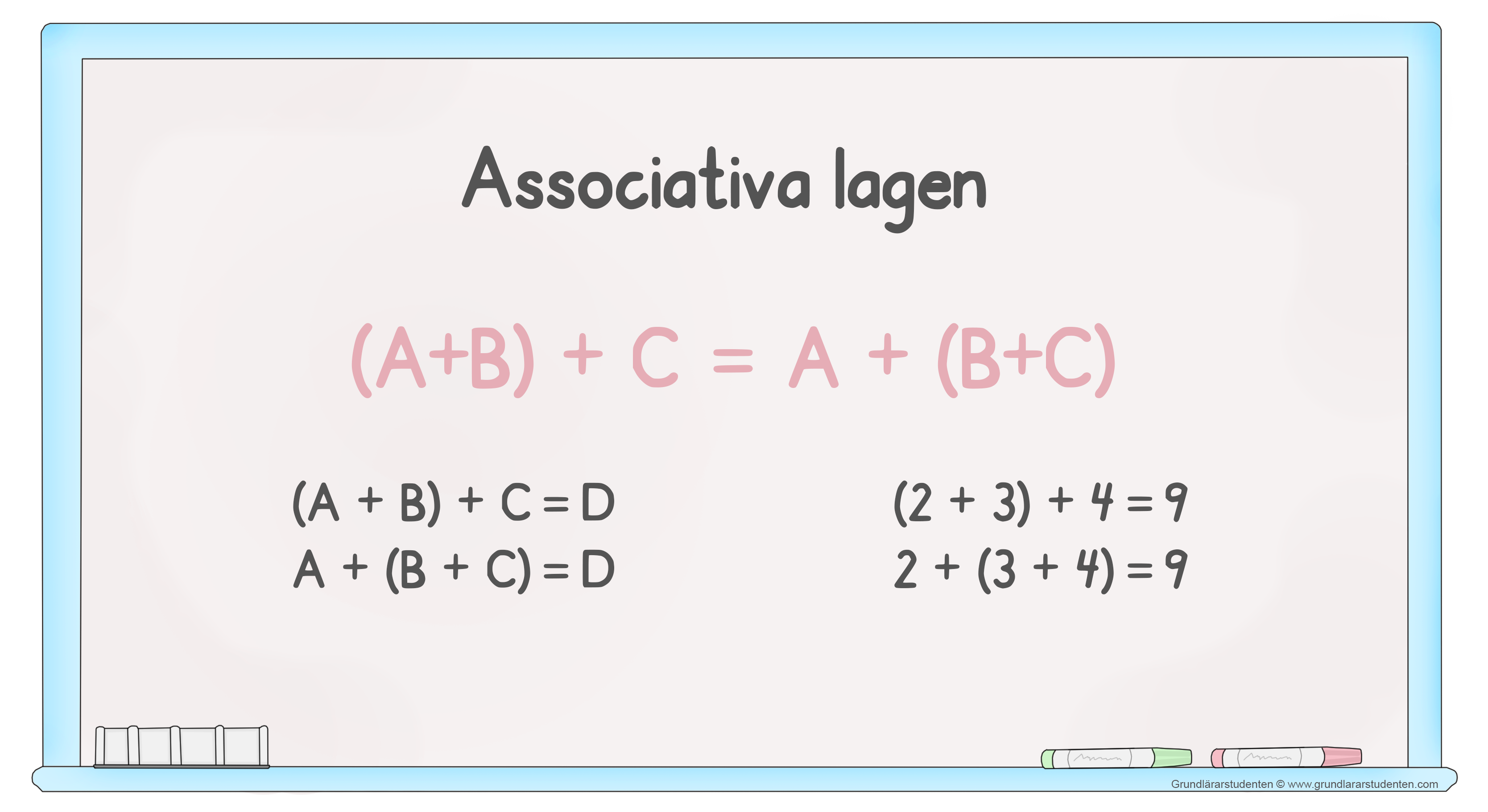 Den associativa lagen är en matematisk regel. Den säger att det inte spelar någon roll hur du sätter ihop siffrorna när du ska räkna, så länge du behåller ordningen. Det fungerar med addition och multiplikation.